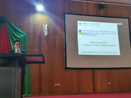 论坛围绕轻量化材料、智能生产、可持续交通等议题展开深入交流。董焱章教授在报告中系统介绍了负泊松比超材料在电动汽车碰撞安全性与轻量化设计中的创新应用,通过拓扑优化技术实现材料结构的高效吸能与轻质高强特性,为新能源汽车的安全性能提升提供了新思路,其研究成果彰显了我院在智能制造与新材料领域的科研实力。