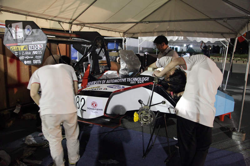 9月4号上午一大早,指导老师邓召文和队长余晓伟便前往赛场,进行赛车的制动测试排队,我们的赛车一次就通过了制动测试,标志着车队完全通过日本赛车检。通过车检后,立马进行直线加速和八字环绕的比赛项目。直线加速由第二届车队队长王海杰驾驶车辆完成,最快时间为4.23s,排名第8,八字环绕项目排名第16名。下午13:30便进行了赛车高速避障项目的比拼,分别由车手王志永、王海杰驾驶赛车完成了比赛,动态赛第一天比赛圆满完成。