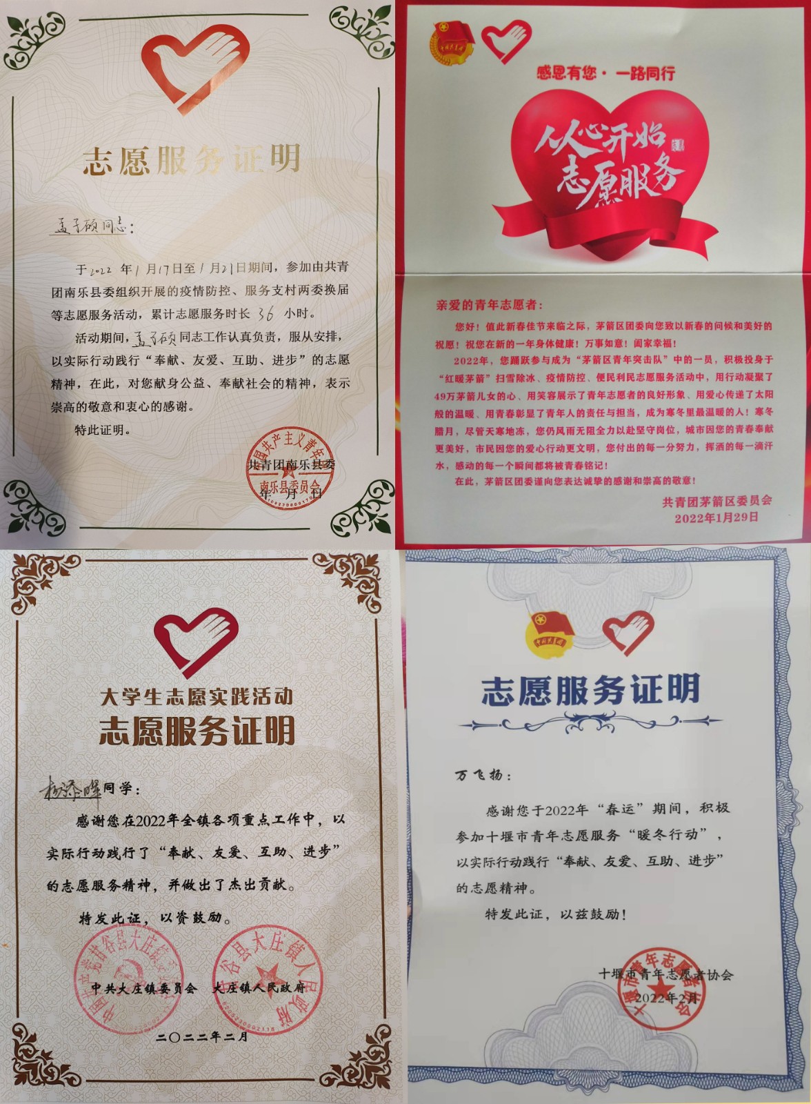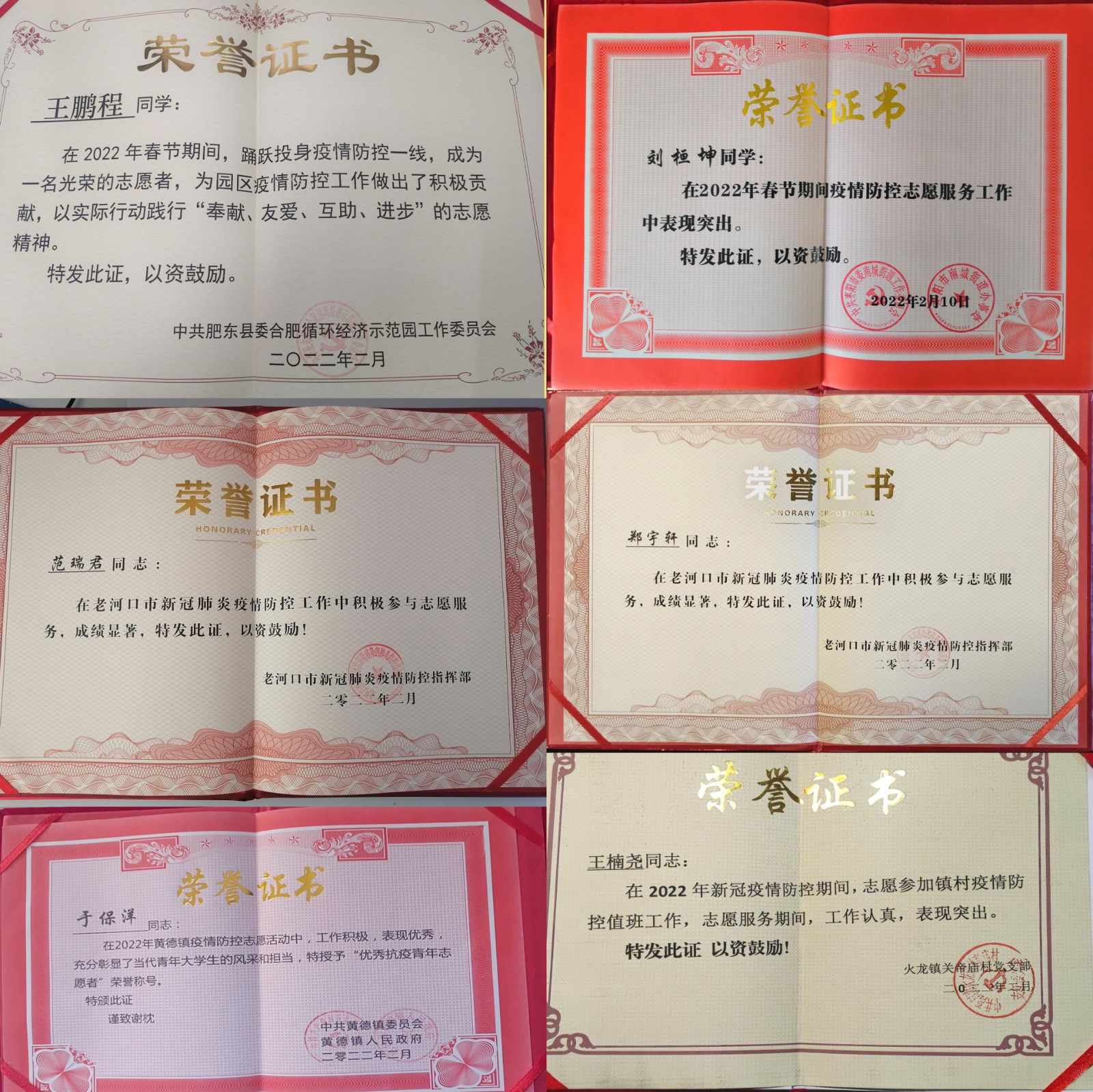 近日,换妻 收到十堰市青年志愿者协会、湖北老河口市防疫指挥部、广西梧州市藤县宁康乡料南村委会等多地发来的表彰证书与感谢信。信中对我院车辆216班庞佳兴、万飞扬;车辆212班于保洋、范瑞君;车辆213孟子硕、黄洪涛、杨添晖等多名同学在家乡疫情防控服务工作中的突出表现表示高度认可和衷心感谢。