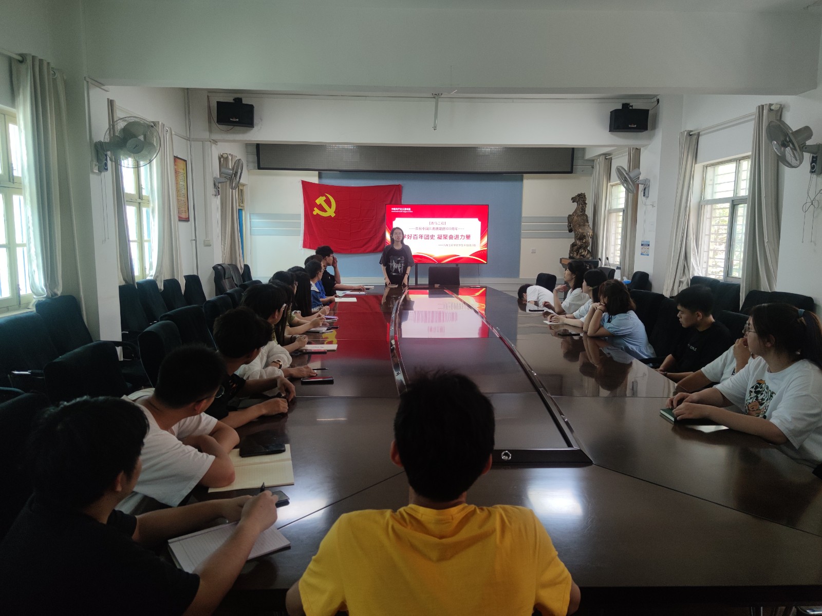 5月23日中午,辅导员李键雯带领全体学生会干部于学院二楼会议室集中学习习近平总书记的重要讲话精神,她做了题为“学好百年团史、凝聚奋进力量”的主题培训,在会上她讲到:“100年来共青团始终牢记坚定不移跟党走、为党和人民事业不懈奋斗的初心和使命,坚持‘党有号召,团有行动’的光荣传统,团结带领一代又一代中国青年冲锋在前、担当作为,谱写了一曲曲与人民同命运、与祖国共奋进的青春之歌。”她积极号召学生干部要有责任、有担当,团结带领广大团员青年勇做新时代的弄潮儿。