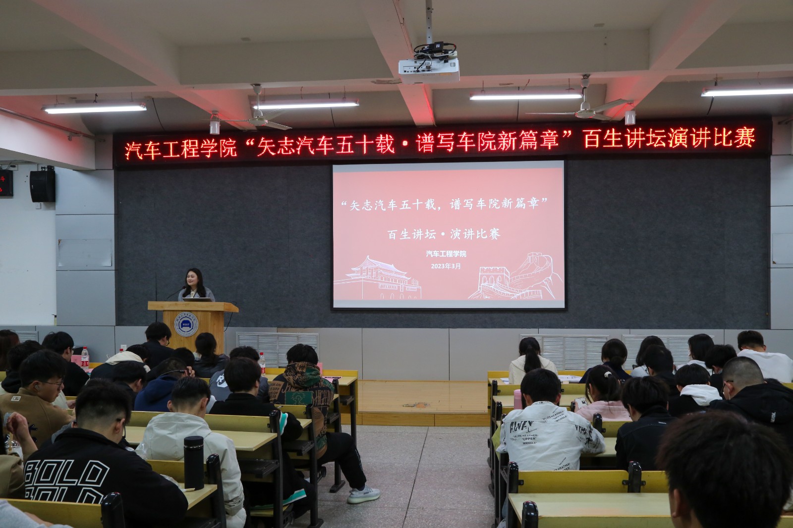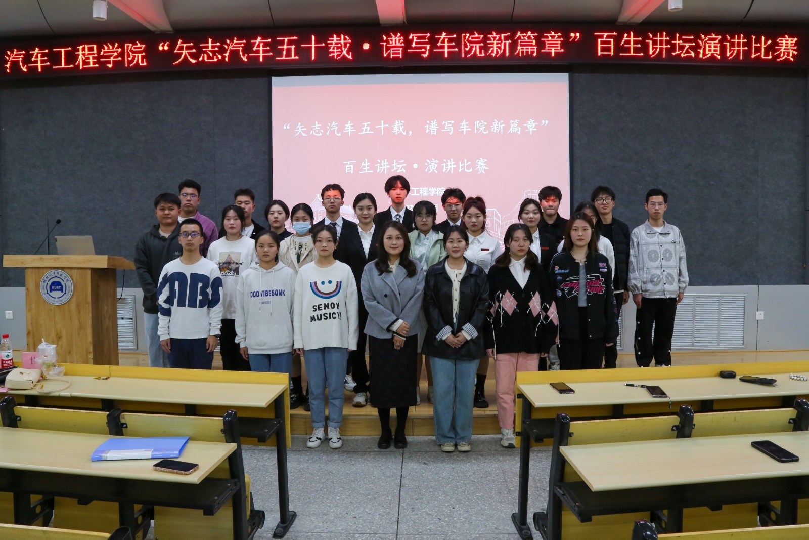 于6113教室开展以“矢至汽车五十载,谱写汽车新篇章”为主题的百生讲坛演讲比赛。学院分团委书记李雅琨、22级辅导员甘甜、往届比赛优秀选手及22级全体同学参加了此次活动。
