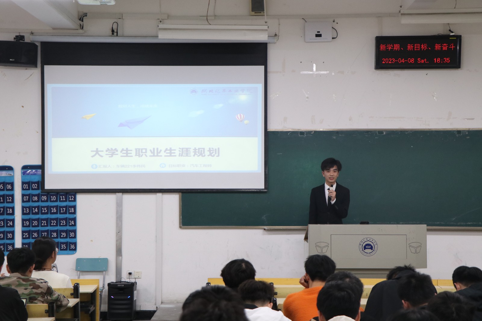 经过前期的作品筛选环节,共有8位选手进入到最终的决赛;决赛中每位选手的展示分为自我介绍、职业规划陈述和答辩三个部分。在职业规划陈述部分,选手们从职业认知、职业决策、计划与路径、评估与调整等方面细致讲述了自己的职业发展目标与规划。来自车辆212的8号选手汤文杰向大家介绍了成为一名智能控制系统工程师的职业规划,他在学校智能车车队的经历也让大家听得津津有味。最终,经过激烈的比拼,来自NEV223班的陈豪同学获得一等奖。活动最后,十堰市2022年模拟求职大赛二等奖获得者、车辆203班的刘伯通同学与大家分享了自己在科研竞赛、就业类活动等方面的经历,鼓励大家积极参加各类就业比赛,树立正确的就业观、提升自身的就业技能。李旭对本次比赛进行了总结,并向同学们提出了两点建议:放眼长远与立足当下相结合,胸怀大局与关注细节相结合;积极规划大学生涯与职业生涯,向着自己的人生目标迈进。