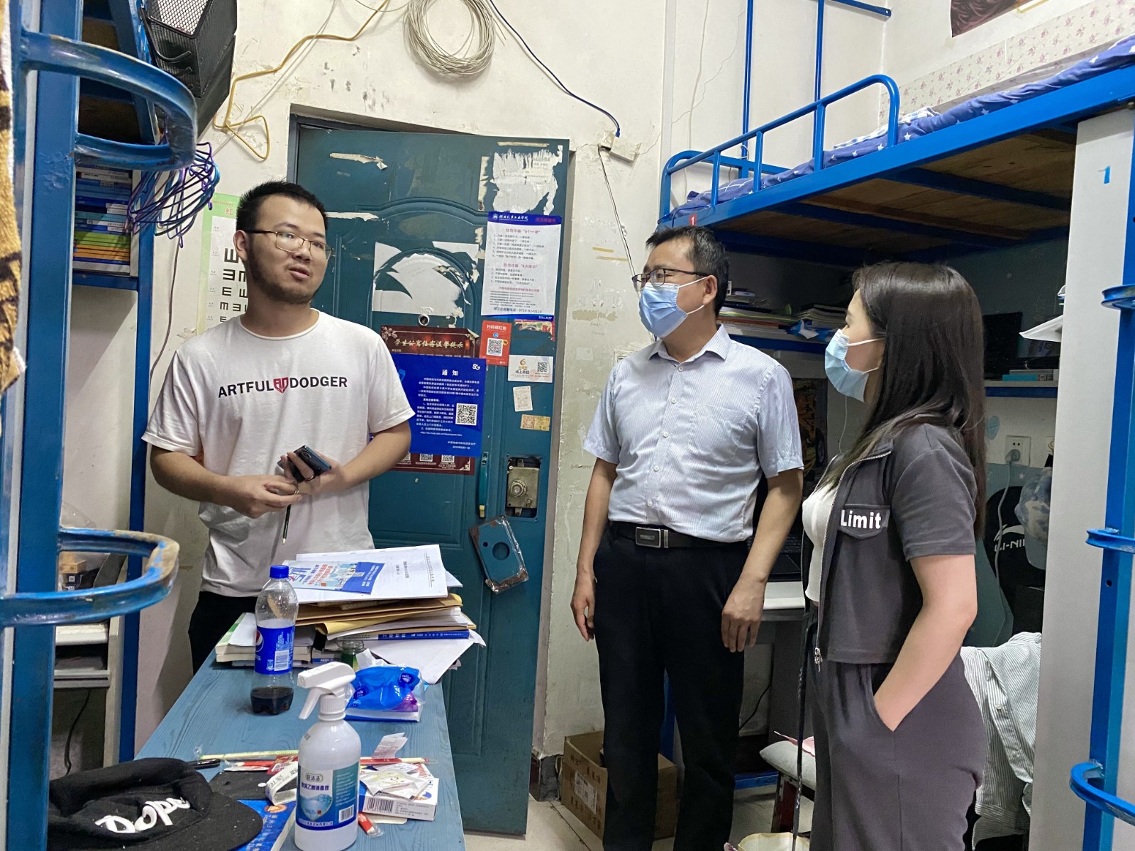 在桃四男寝走访过程中,杨亚会与19级车服班同学们围绕就业、升学以及毕业论文、答辩的准备情况进行了深刻交流,针对学生反馈的离校程序和安排了解不及时、进档材料填写要求不清晰等问题,他表示一定尽快协调解决,让所有的毕业生都能够体验更高效更有爱的毕业季。在调研21级、20级宿舍时,他认真检查了寝室配套设施是否安全,关心大家的身体健康状况,提醒大家要做好寝室内务、及时通风,时刻防范流行疾病的传播。养成将垃圾带下楼的良好卫生习惯,相互监督提醒,积极配合学院公共区域卫生治理工作。同时他还逐一检查了各寝室的“防诈贴士”的张贴情况,并亲自为部分寝室张贴了“全校参与,共创无诈校园”的新宣传海报,结合近期发生的电诈典型案例,讲解防范措施,再三告诫同学们从思想上保持警惕,提升个人反诈能力、素质,认真学习反诈常识,增强个人法制观念,守住法律底线。