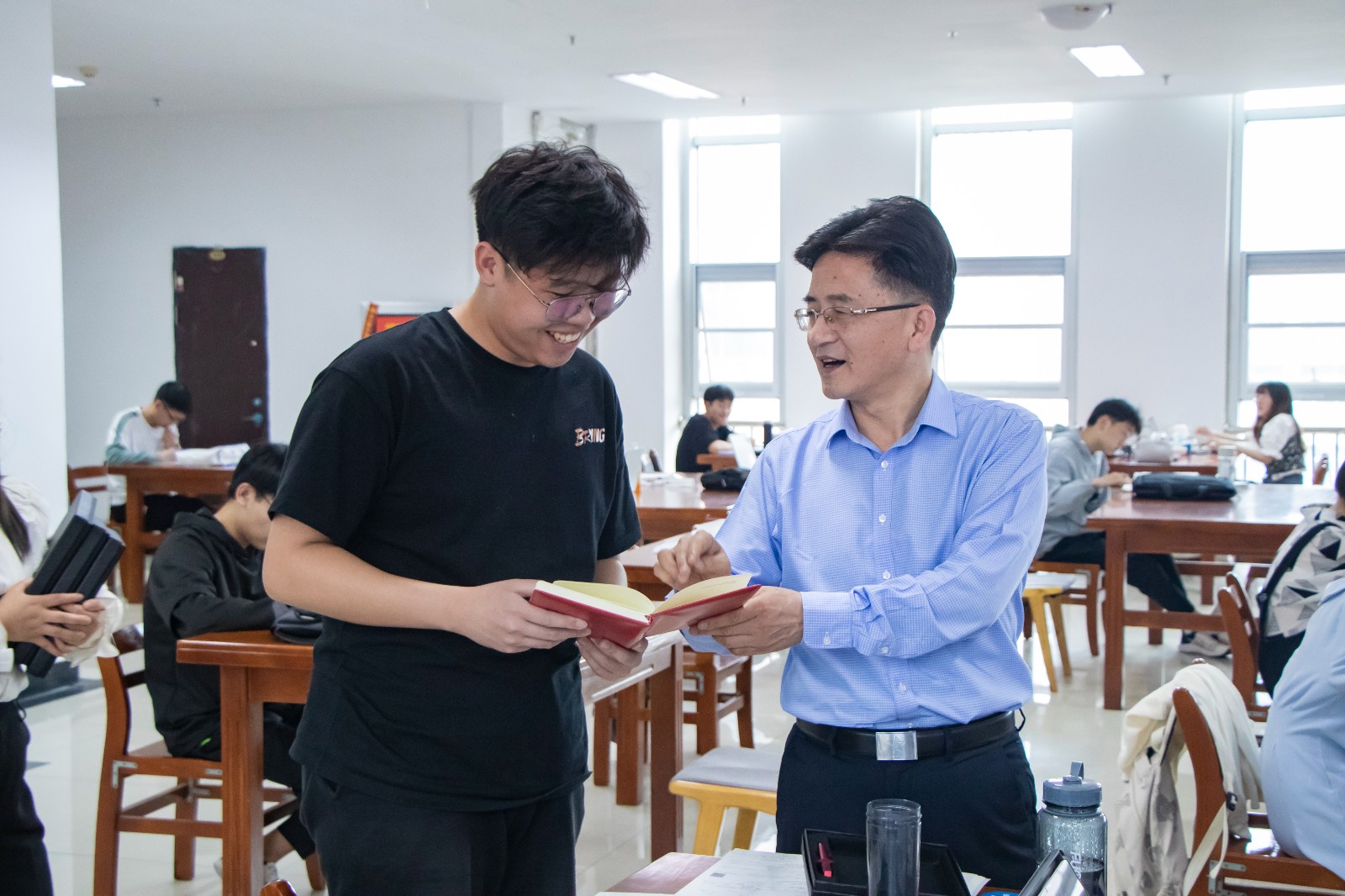 20级考研学生集中复习区,张文学仔细询问了车辆203班金浩东同学的复习情况、班上整体的考研比例、择校方向和复习状态。当了解到当前存在学生考研专用教室匮乏、考研针对性辅导力度不足的问题时,张文学一一记录,并表示会尽快解决,尽全力为考研学子创造良好的学习条件和环境。随后,张文学为4名考研学子送上了亲笔签写祝福的笔记本,勉励在场考研学子,牢记习近平总书记嘱托,高扬理想风帆,肩负时代责任,刻苦学习、锤炼本领,勇敢追梦、提升自我。