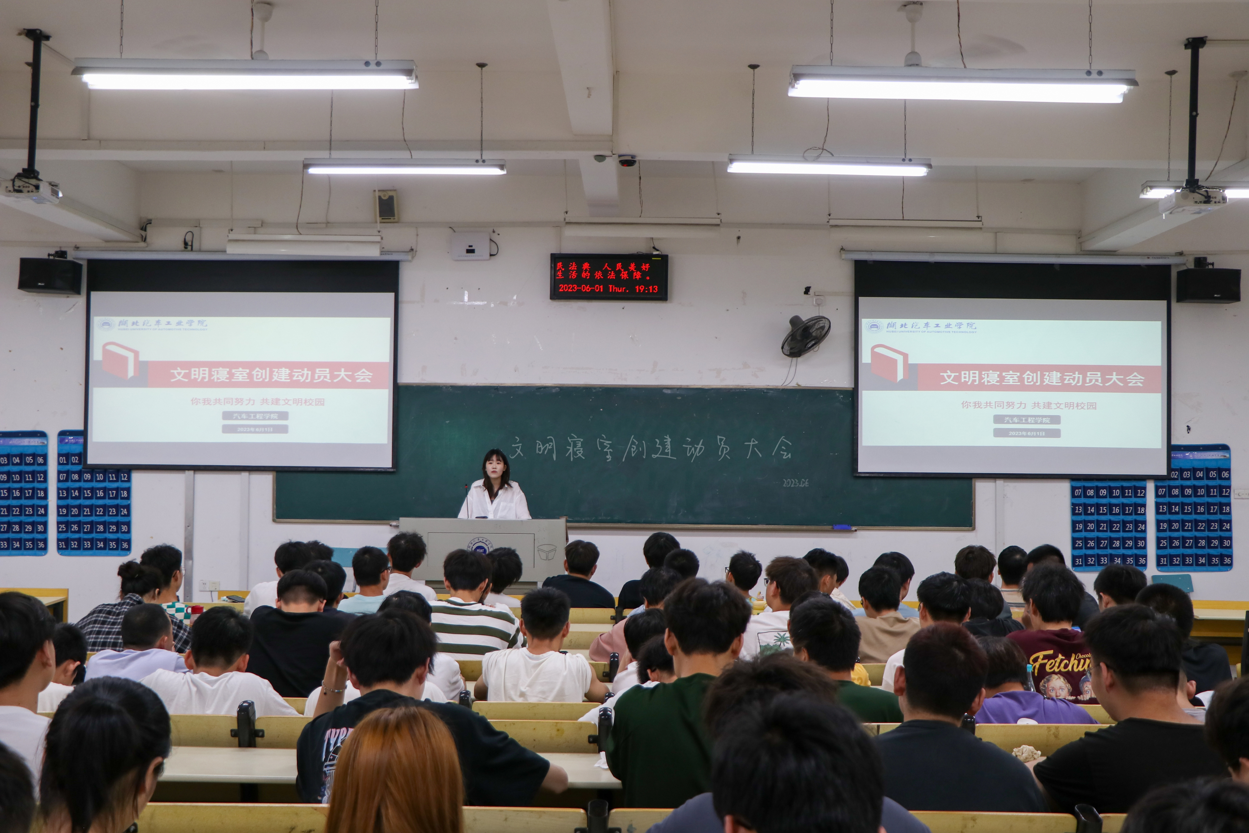 在6111教室开展文明宿舍创建动员大会。学工办辅导员甘甜,22级全体学生参加了此次动员大会。