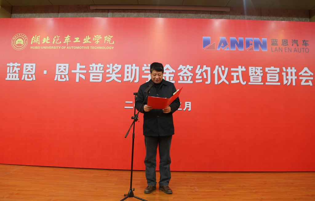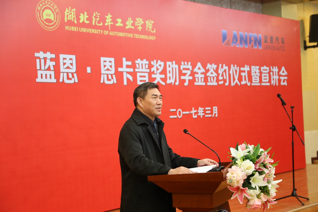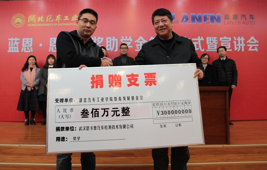 03届校友、武汉蓝恩新能源汽车产业发展股份有限公司董事长蒋武代表公司与母校在逸夫图书馆报告厅签订了奖助学金捐赠协议,为母校捐赠300万元设立“蓝恩·恩卡普奖助学金”,这也是我校自建校以来校友企业最大单笔捐赠。