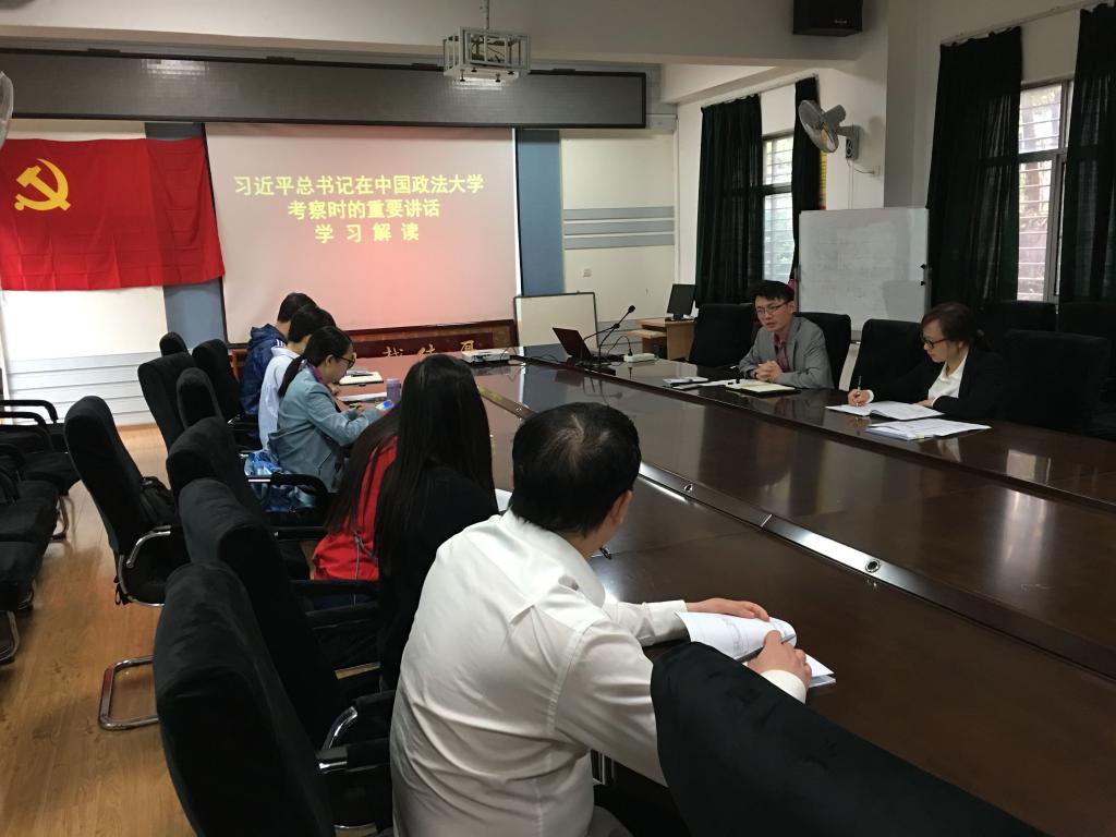 会议伊始,李秀峰针对习近平总书记在中国政法大学考察时的重要讲话精神进行了解读,详细介绍了习近平总书记对法治人才培养以及对青年修养成才的详细阐释和要求,倡导所有辅导员、班主任在今后的教育中,更加注重引导青年大学生“时常用真善美来雕琢自己”、“像海绵汲水一样汲取知识”,德法兼修、德业双成,成长为“不忘初心跟党走”的合格社会主义建设者和接班人。集中学习之后,辅导员吴蔓以“人生的长度、宽度、高度”为主题,与大家分享了个人从事学生工作的经历和体悟,指出作为学工人,要时刻站在学生的角度付出感情和爱,引导学生充实而乐观的面对生活,在努力实现个人的价值同时实现我们共同的信仰和追求。其他班主任和辅导员随后也交流了个人对学生思政工作的认识、经验和困惑,对进一步做好学院的学生思政工作提出了意见建议。