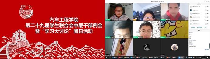 最后,胡霄寒总结到在疫情防控期间作为一名学生干部,我们要坚定树立责任意识、榜样意识、服务意识,正当合理推进各项工作,创新工作形式和做法,保持车院学生会的活力,同时要以身作则,服从各科老师安排,积极进行线上线下学习。充分利用居家隔离的时间,促进家庭情感交流,养成规律的饮食和作息时间,提高个人体能。