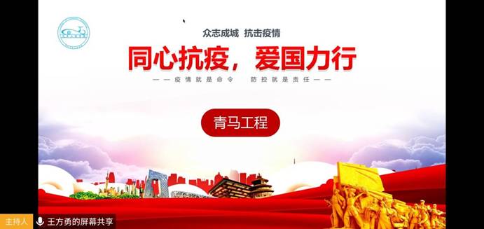 分团委副书记王方勇主持活动,介绍了学院2020年青马工程的总体计划和疫情期间开展此次活动的目的及其必要性。随后,学生党支部书记李雅琨作为此次活动的主讲人,以“同心抗疫、爱国力行”为主题进行了深刻的剖析和讲解。疫情就是命令,防控就是责任,她结合疫情期间国家快速组织专家、医疗物资、生活物资等各种资源同心抗疫的一个个实例,让同学们认识到中国特色社会主义制度集中力量办大事的优越性;通过疫情发展中,党中央的正确领导和基层一封封一线“请战书”清晰展示了中国共产党的伟大号召力;透过“最美逆行者”、志愿服务人员等奋战在一线抗疫防疫的人们和社会各界爱心人士的捐助、支援,讲述了人民力量的伟大,引申出爱国主义其实就在我们每个人的身边,我们青年人都要用自己的实际行动为国家为社会贡献一份力。她呼吁所有的车院学子们不断强化四个意识、坚定四个自信、践行两个维护,不信谣、不传谣、不恐慌,坚守光明、理性思考、传递正能量,争做新时代的青年榜样。