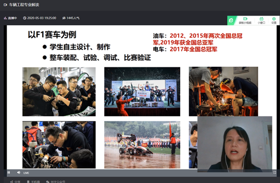 本次网络宣讲会,李楚琳分别从车辆工程专业概况、国家对车辆工程的专业需求及发展趋势、人才培养及发展方向以及车辆工程专业特色四个方面,结合我校车辆工程的“国家一流专业”、“通过工程教育专业认证”、“卓越工程师的摇篮”、“F1赛车国内顶尖”等特色,详细介绍了车辆工程专业优良的发展前景、火爆的市场需求、良好的专业发展进程、雄厚的师资力量以及先进的科研平台等多方面内容。清晰的脉络、详实的内容,受到了考生及家长的一致好评。最后答疑环节,对于“车辆工程专业新能源方向”、“新的经济形势下汽车行业未来”等一些代表性问题进行了回答, 增强了考生和家长对选择车辆工程专业的信心。在直播期间,学工部曾又、吴媛媛、明瑞雪,换妻