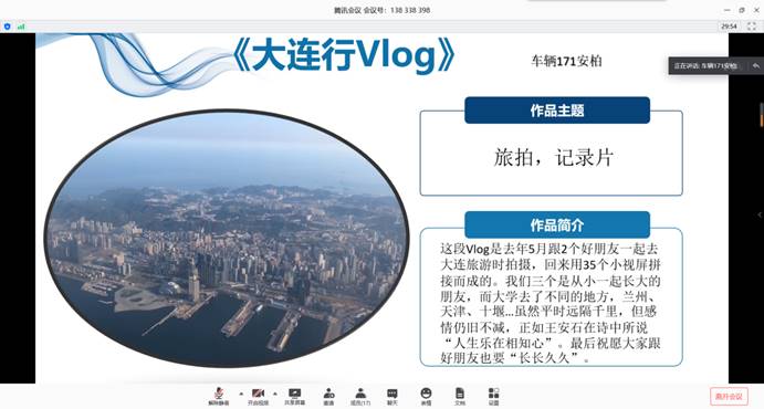 活动从4月上旬开始到,整体分为三个阶段进行。初赛阶段,通过网络投票方式从征集到的60多个视频作品中评选出10个作品进入决赛。决赛环节,选手们通过QQ课堂用3-5分钟时间结合PPT将创作作品的主题与内容、剪辑手法、创意点呈现给评委。最后,在综合评委的评分表决下,车服191班安婷同学的《回归的信念》凭借着唯美的古风形象和动人的故事情节征服全场荣获比赛一等奖。而其他作品也都是用心之作,车服171安柏同学的《大连行vlog》按照时间顺序,从多个角度分享了自己在大连的旅程,表达了“读万卷书、行万路路,每一次旅行都是人生的成长”的感怀;车辆192班张嘉瑞同学的《潼》分享了家乡的风光和日落美景,镜头中都是家乡无法忘却的一草一木,人与自然和谐相处之美感油然而生。在第三个阶段,换妻