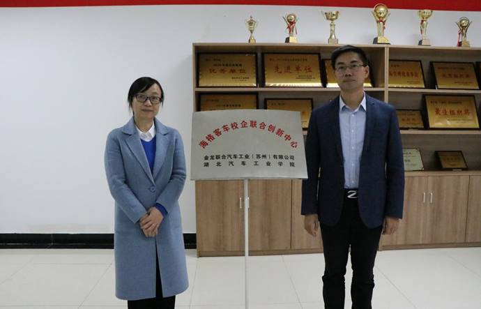 仪式上,周红妮就学校发展历史、专业概况、教学情况、人才培养特色与成效、未来发展等进行了全面介绍。金龙公司的唐英部长详细介绍了海格客车概况,并从课程体系、经典项目、人才培育模式与成长方向等方面详细介绍了海格班培养体系。随后,宋世民、冯樱分别代表企业和学校进行了校企联合创新中心的揭牌及技术服务合作签字仪式,并为入选海格班12名同学赠送了工作服。为加强校企联合培养人才水平,会上还聘请金龙公司王善科主任为海格班客座教授,并由学校教务处副处长李建颁发了聘书。