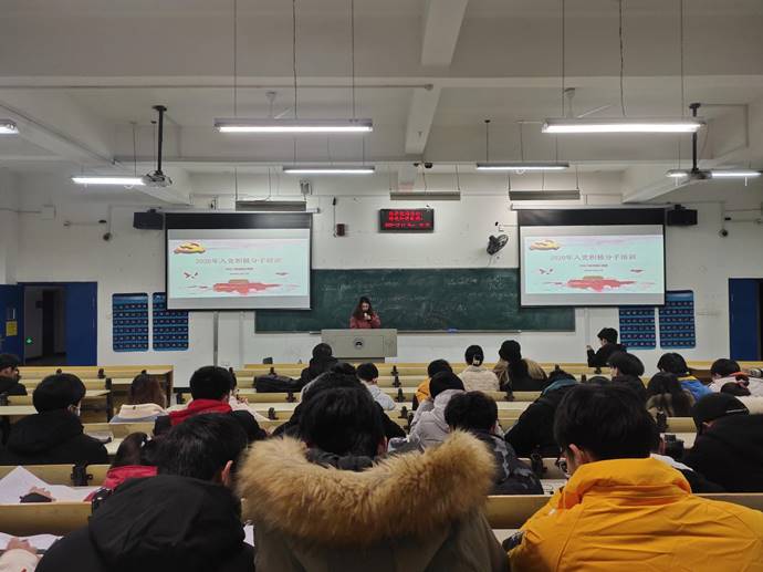于6111教室举办入党积极分子集中培训活动,此次共有122名积极分子参加,学生党支部书记李雅琨主讲。