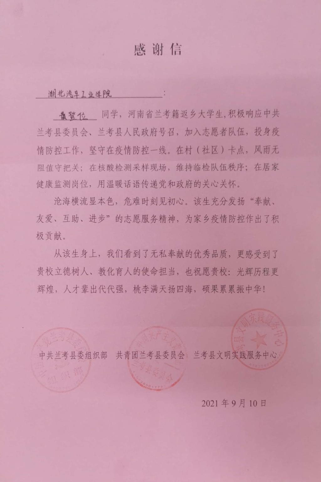 学生黄登位主动请战、勇于担当,积极投身于河南省兰考县疫情防控工作。近日,兰考县委组织部和兰考县文明实践服务中心向我校致信感谢换妻