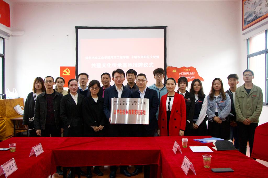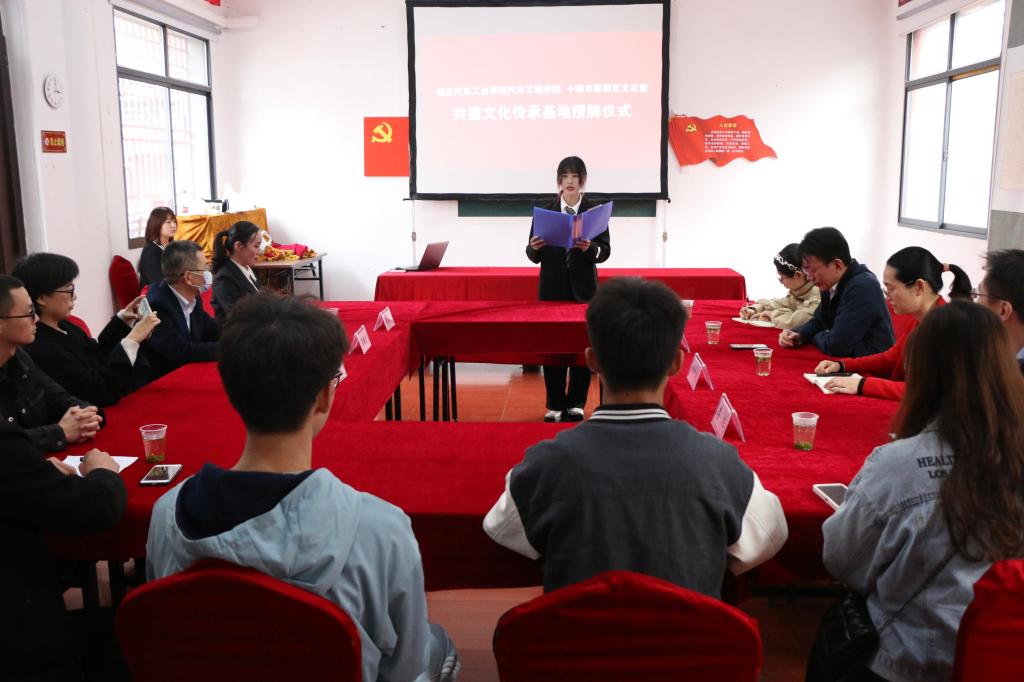 大学生社会教育实践基地,将一同承载郧阳文化,期待将来尽快让郧阳非遗文化走进汽院校园,扩大文化影响力。“拾遗·寻粹”启为创新团队队长王子翔对此次授牌仪式感慨道“学院与郧阳区文化馆建立文化传承基地,让非物质文化遗产得到进一步的传承,我们学生也将拥有更多的学习机会,领略非遗文化的魅力。”