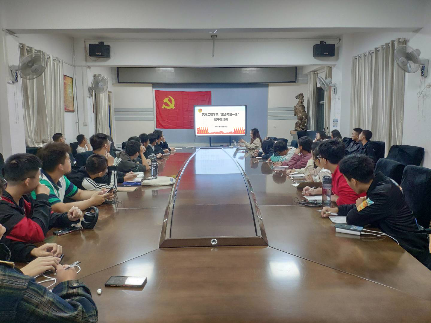 分团委于2021年10月16日19时在汽车大院二楼会议室组织21级全体团员进行了学习。辅导员李键雯、分团委学生干部以及21级全体团员参加了此次培训会。
