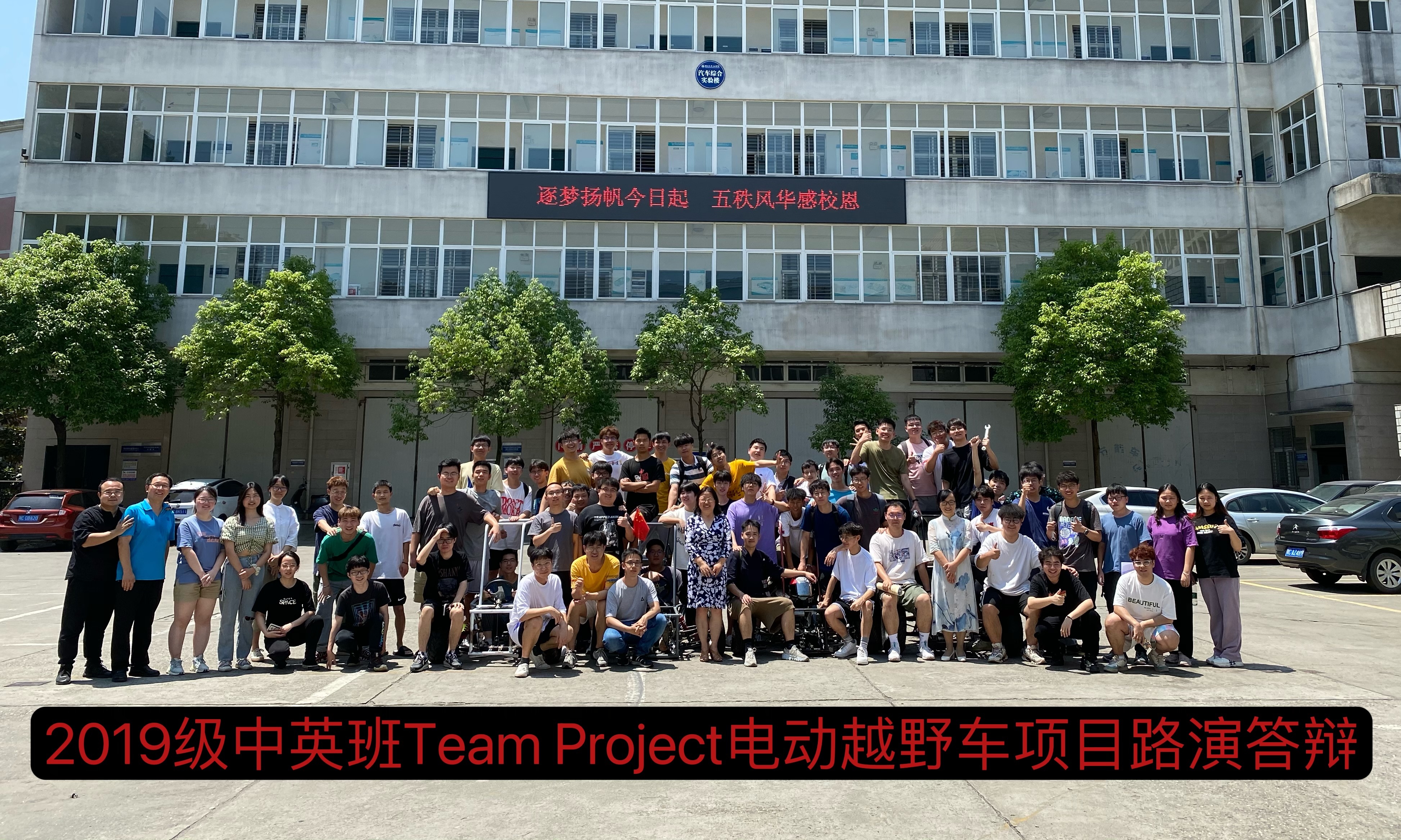 会议室,2019级车辆工程(中英合作)专业的68位同学开始Team Project课程“小型电动越野车”项目的结课路演答辩,冯樱、郑冬黎、邓召文、石振、金家琛等老师作为答辩导师团队出席答辩。