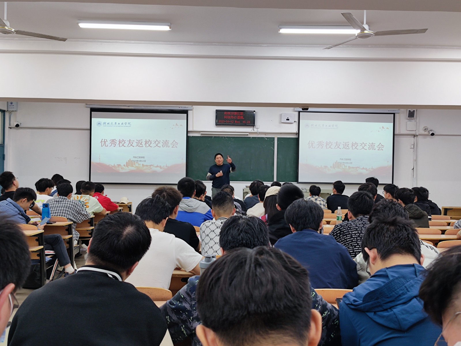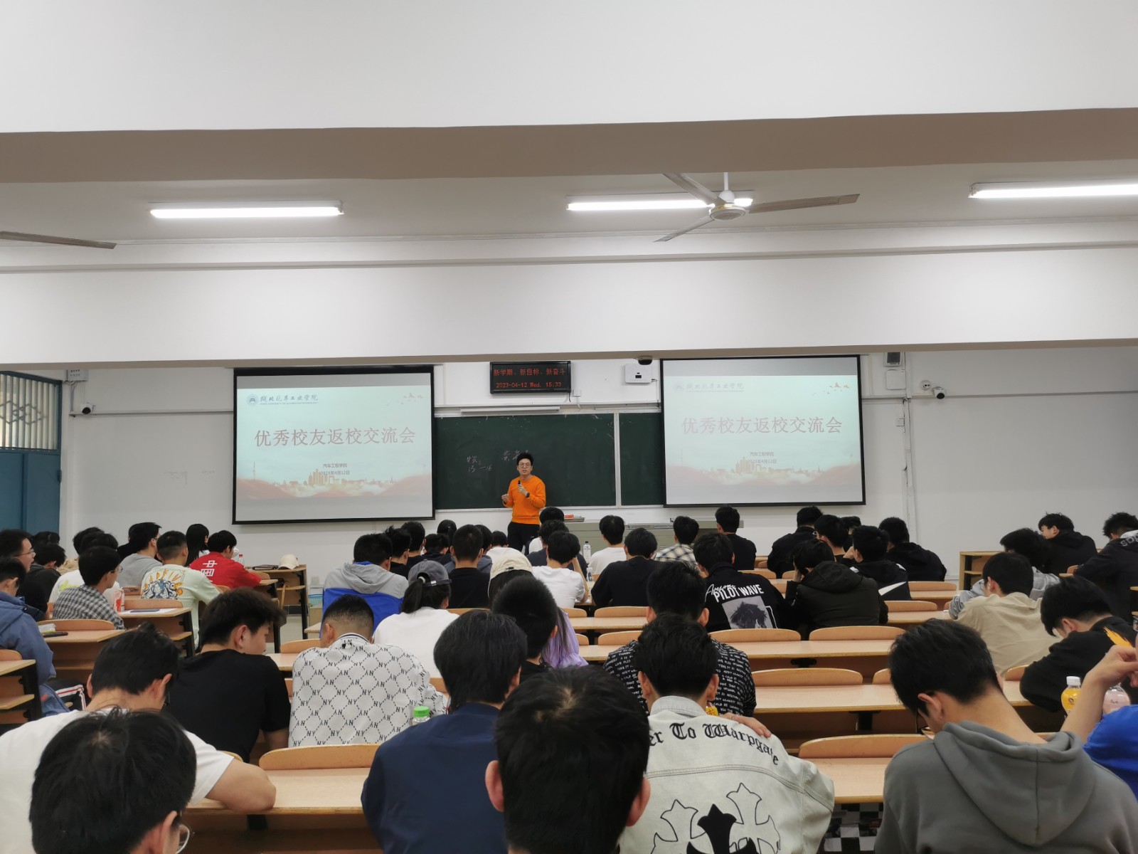 在5203教室举办了优秀校友交流分享会。此次经验分享会特意邀请了广汽乘用车宜昌分公司技术质量部的龙海粟和黄海涛两位优秀校友,分党委副书记杜昕俊以及100余名学生代表参加会议,学工办主任胡霄寒主持会议。