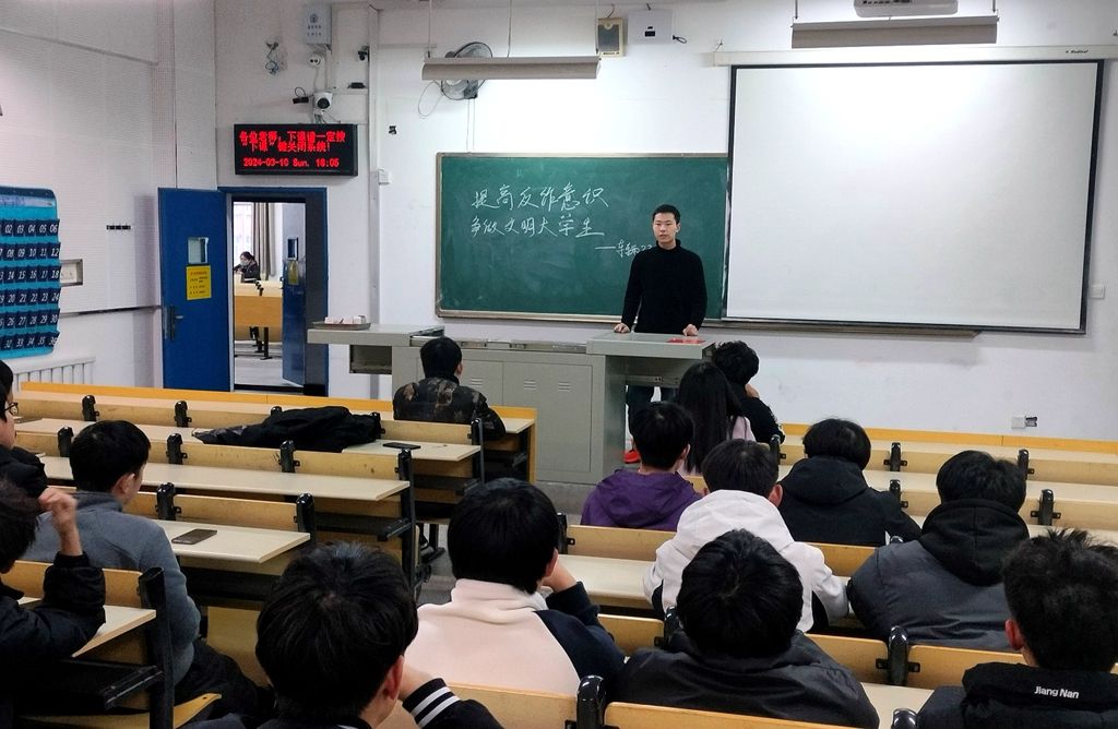 各年级辅导员、班主任利用晚点名组织学生开展“防范电信诈骗”主题班会,并邀请多名学生宣讲校园内和身边发生的诈骗案例,让学生从被动灌输的角色转换为主动发挥影响的身份。