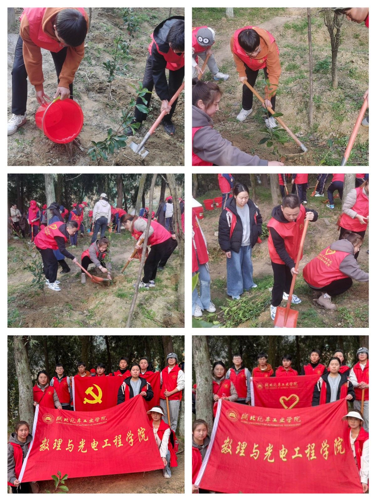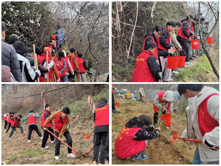“挖得再深一点,这样更容易存活”“小心点拆,别把根损坏了”“给它浇点水吧”......在艳湖社区,一个个身披红红马甲,面朝黄泥巴的青年学子风风火火地忙活着,他们一起挖坑、理苗、栽种、培土、浇灌,大家团结协作,细心栽培,经过一个小时的劳作,一株株石楠树幼苗挺拔于春风中。