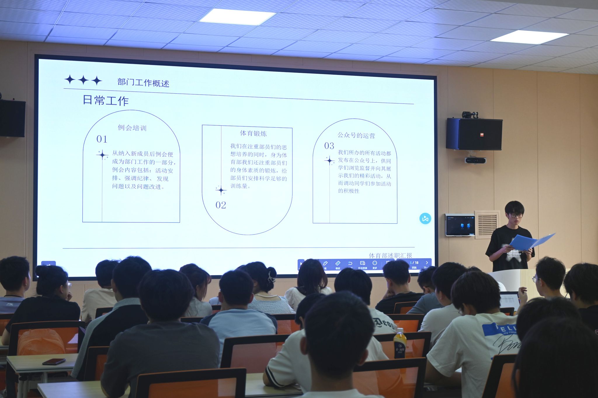 学生会执行主席陆致远做学生工作总结讲话,他详细阐述了这一年来取得的工作成果,对中层干部的积极付出做出了充分的肯定。随后各个部门通过PPT的形式依次展示了本年度的工作内容以及工作重点,对过去工作中存在的问题做出总结,并对未来学生工作提出规划。