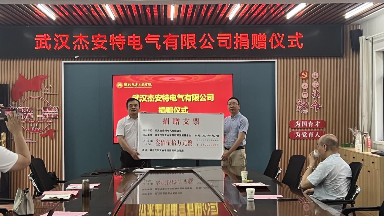 会议室举办了武汉杰安特电气有限公司向学校捐赠350万元的捐赠仪式。武汉杰安特电气有限公司总经理吴林辉、换妻