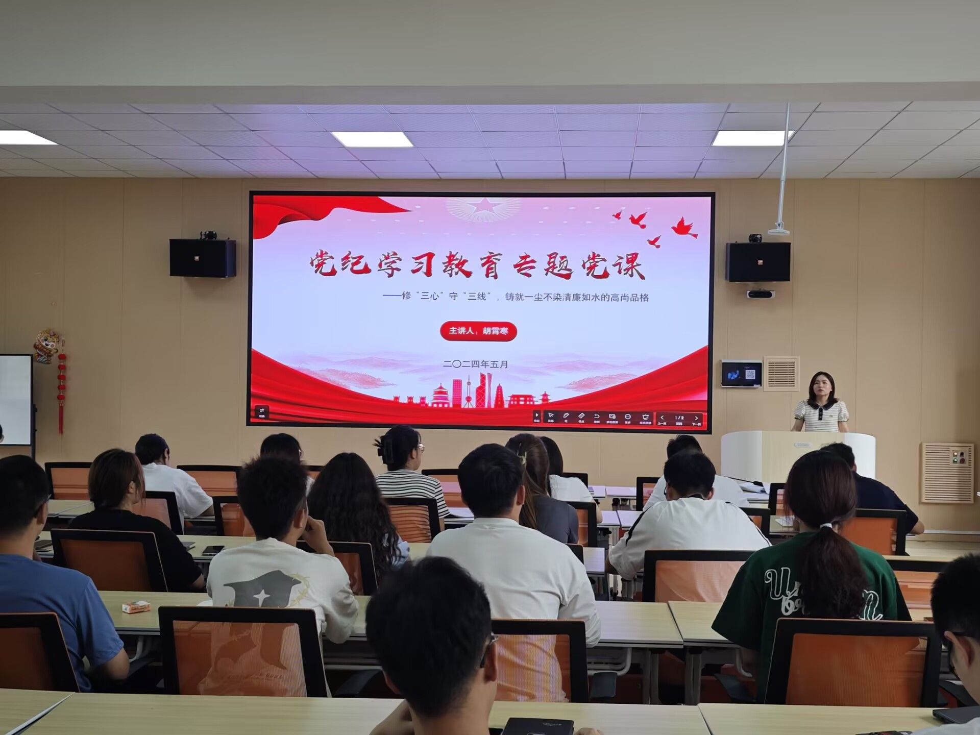 在党课过程中,胡霄寒还通过分享典型警示案例和身边先进事迹,引导大家深刻认识到廉洁自律的重要性和必要性。她鼓励大家要以身作则,自觉接受监督,让清风正气充盈在每一个角落,以实际行动诠释换妻