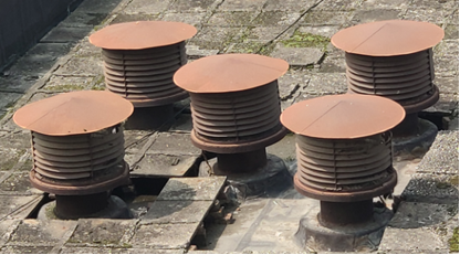 动力实验楼楼顶安装了轴流风机,可对实验室进行强制通风,风机上方加装了防雨罩以防止雨水、昆虫进入,同时确保空气正常流通(如下图所示)。现防雨罩因使用年限过久,已严重锈蚀损坏,出现了雨水渗流进实验室的现象,易导致电气设备短路,威胁实验人员和设备的安全。现需对原有防雨罩进行拆除,并制作和安装新的防雨罩,以达安全使用要求。