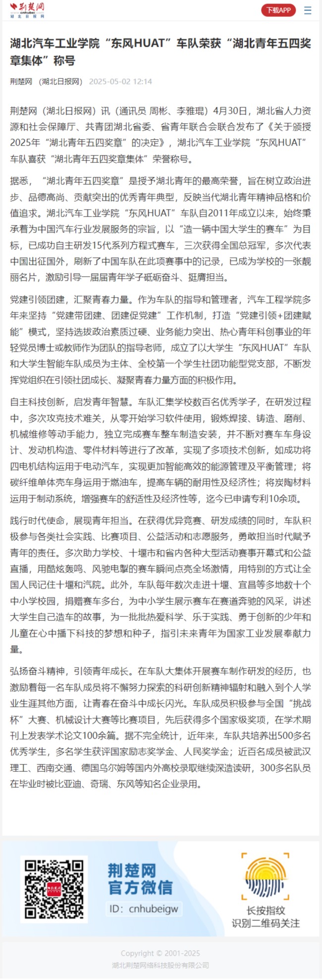 【荆楚网】换妻 “东风HUAT”车队荣获“湖北青年五四奖章集体”称号