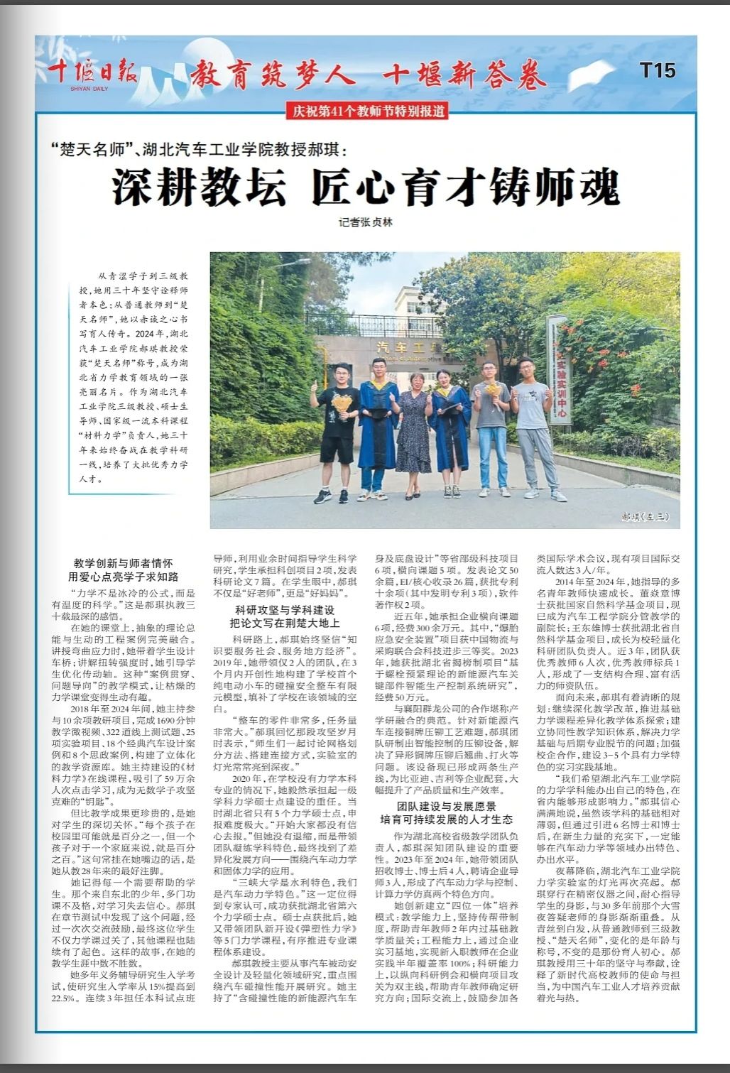 作为湖北高校省级教学团队负责人,郝琪深知团队建设的重要性。2023年至2024年,她带领团队招收博士、博士后4人,聘请企业导师3人,形成了汽车动力学与控制、计算力学仿真两个特色方向。