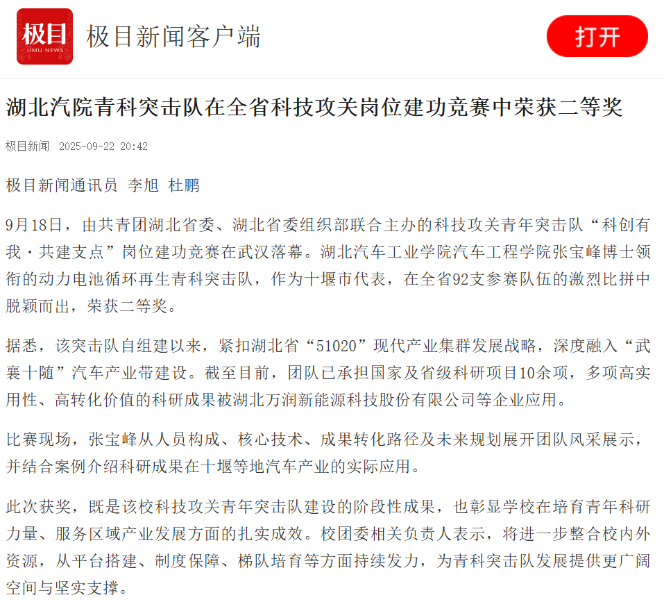 【极目新闻】湖北汽院青科突击队在全省科技攻关岗位建功竞赛中荣获二等奖