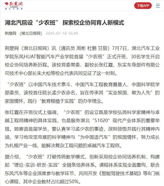 【荆楚网】湖北汽院设“少农班” 探索校企协同育人新模式