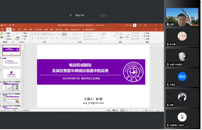 讲座中,吴桐博士以商用车为例讲解了线控系统的行业现状,对电控机械制动总体架构、线控制动方案、电控机械制动典型方案做了深刻的讲解,最后结合以往和目前的工作对电控机械制动在智能车辆线控底盘中的应用做了充分的展示。在互动环节,吴桐博士热心解答了老师和同学们的问题,就电控机械制动产业化落地进行了充分的讨论。